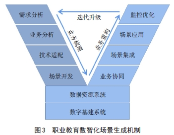 V字下行阶段,全面梳理职业院校校企合作、教育教学、内部治理三个领域的核心业务,从宏观到微观,实现核心业务数字化,构建三大领域中各子场景;V字上行阶段,重构业务流程,构建业务协同系统,将关联业务场景组装集成为“综合场景”,从微观到宏观,寻找“点—线—面—场景生态”的最佳解决方案,推进场景思维、组织架构、业务流程、技术工具等整体性优化和系统性重塑,最终实现内部持续增能与自我升级。