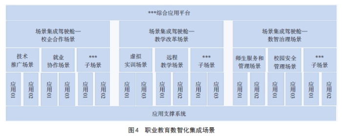 第六步是实现场景集成。职业教育数智化场景由一系列的子场景、应用构成,通过数字技术将相对孤立的单一场景演变成多维度、立体式、广覆盖的数智化集成场景,实现对旧场景的迭代创新。创建场景集成驾驶舱DEMO,为部门改革流程、建立新的业务机制提供帮助。对于独立性较强的场景和应用,还需要有相应的工作机制完成数据和业务流程的跨部门跨层级协同(图4)。
