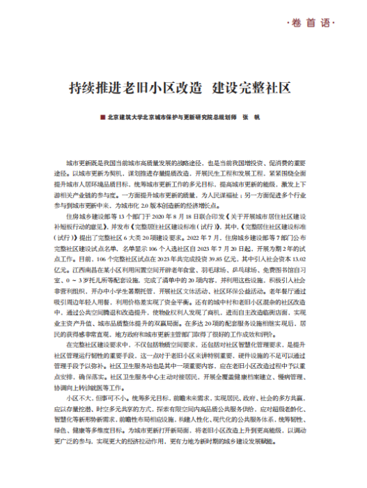 小区不大,但事可不小。统筹多元目标,前瞻未来需求,实现居民、政府、社会的多方共赢,应以存量挖潜、时空多元共享的方式,探索有限空间内高品质公共服务供给,应对超级老龄化、智慧化等新形势新需求,前瞻性布局相应设施,构建人性化、现代化的公共服务体系,统筹韧性、绿色、健康等多维度目标。为城市更新打开新局面,将老旧小区改造上升到更高能级,以调动更广泛的参与,实现更大的经济拉动作用,更有力地为新时期的城乡建设发展赋能。