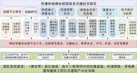 本项目面向国际先进制造与建造技术方向,重点解决我国钢结构模块化建筑设计、生产与施工验收等应用瓶颈问题,创新成果包括:系统提出抗震地区钢结构模块建筑结构体系用连接节点与设计方法,研发出自锁式机械连接与螺栓连接等快速拆装节点,实现了偏差自适应、快速安装、可重复拆装等功能,解决了模块连接设计的安全性与可靠性问题;研发提出板式快速拆装钢结构集成模块化建筑结构体系及其设计方法,实现了模块化建筑轻量化,解决了运输及场地条件受限等应用难题。项目成果形成T/CECS 641—2019《箱式钢结构集成模块建筑技术规程》与《装配式钢结构模块建筑技术指南》,并在10余个项目中应用,标志着我国模块化建筑设计、制造与建设水平达到国际水平。