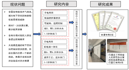 本项目针对极端天气频发对地铁车站正常运营可能造成的影响,重点解决地铁出入口(连通口)洪水倒灌关键技术问题,实现人防设备防护和防洪两种功能,保证地铁内部人民生命财产安全。本项目有2个创新性成果:一是提升现有出入口人防设备的防淹功能,手电两用,可远程、就地控制,满足防护兼防洪需求,实现快速平战转换。当发生倒灌风险时,能迅速自动关闭,利用设备的密闭性发挥防灾减灾作用。二是研发连通口新型滑轨式防淹兼防护设备,手电两用,有效合理利用建筑空间,快速关闭,适用于正、逆水关门,在满足人防需求的同时,避免洪水倒灌风险。同样适用于数据中心、云计算中心等其他重要经济目标的防护工程。该成果已在郑州地铁得以广泛应用,并获得高度评价。