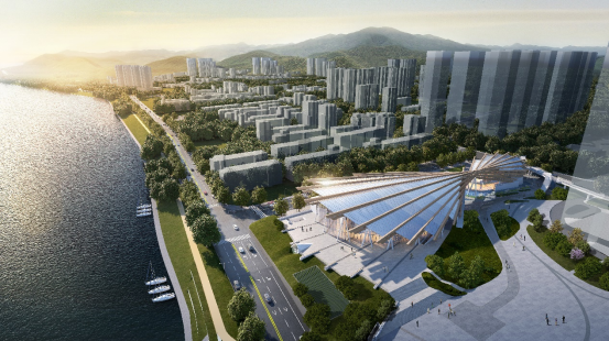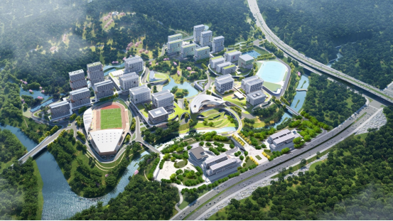 由华森公司规划设计的深圳职业技术大学深汕校区选址于深汕特别合作区赤石镇,四面环山,赤石河和碗窑洞河在此交汇,山水资源丰富。该项目以“傍水依山、润玉环珠”为理念,将山水环境、地貌特征、组团结构、形态特征、教学模式等要点融入方案设计,探索人、校园、自然之间和谐共生的关系。