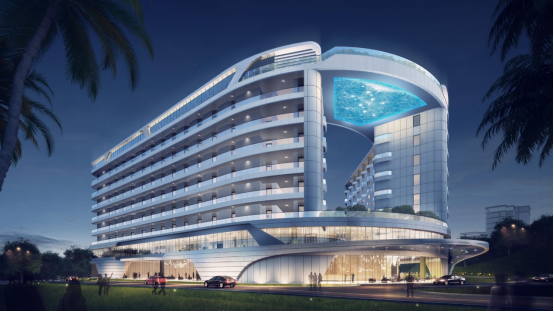 由华森公司设计的深圳彭年企业家俱乐部度假村酒店依山傍海,自然生成一条从城市到大海的景观步道 ,西侧山体公园环抱基地,就像一扇绿色的大门将城市与基地分隔开,形成了高低起伏的地势。结合外部道路的标高,从银滩路进入口后,上行一段路程,可远观本项目标志性建筑酒店。经过酒店区域后,通过清幽宁静的“森林隧道”,进入到环境清幽的专家公寓区,营造了世外桃源般的氛围,打造品质型度假休闲规划。