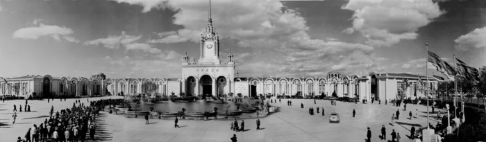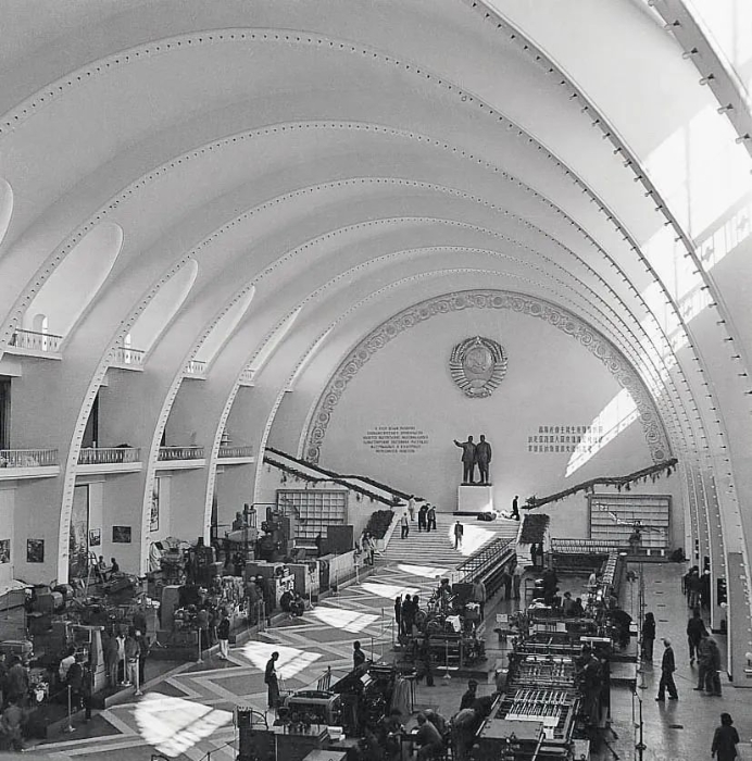 展览馆建筑占地13.2万平方米,主体建筑面积28188平方米,从南面半圆形柱廊广场进入,经过中央前厅沿轴线前行进入工业馆。馆的西翼是农业馆、电影院和餐厅,东翼是文化教育馆。东西两侧形成两个大内院,分别是农业和工业设备的室外展场。工业馆北端是一个3000人的露天剧场和人工湖(图1、图2)。1954年10月2日,周恩来总理为北京苏联展览馆剪彩,同时在这里举行了盛大的集会和展览。