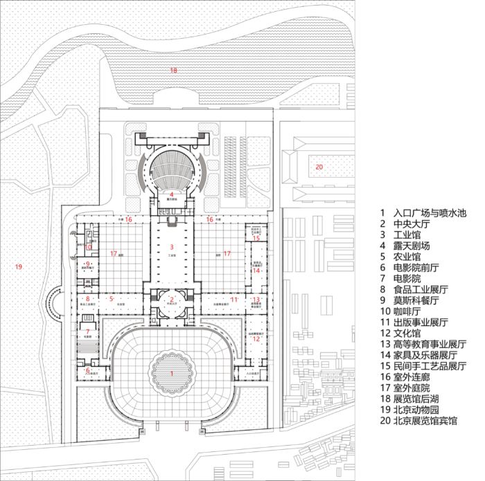 北京展览馆的尖顶位置向东和西直门对位,成为从西直门出城的极醒目的对景。在展览馆北侧,利用地形将西郊公园(动物园)流过来的南长河与洼地略加改造,形成风景绮丽的后湖,不仅和展览馆北侧露天剧场形成互动,还把展览馆与整个北京的绿化体系联结为一体。
