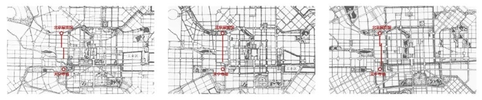 北京苏联展览馆的选址和建国初期北京市的规划有密切关系。早在1950年2月,梁思成和陈占祥提出的著名的“梁陈方案”中即有“在北京城西建造新的行政中心”的表述,由于众所周知的原因未能实现,其中前苏联专家巴兰尼科夫的反对也是原因之一。但所规划的西部轴线和连续的城市绿化空间对1953年版的规划还是有一定影响;尽管1953年的两版规划已不见雄伟的西部轴线,但以北京展览馆场地为底景的一条短轴线还是存在,一直延续到1954年的规划修订稿(图3、图4)。另外规划中也可以看到以京城水系和城墙为基础构建出来的完整网状绿化结构,若能实现,其对城市空间、文化和生态的贡献极大,绝不亚于几十年前奥姆施特德在美国波士顿规划的城市绿化系统“绿宝石项链”。图3 1953年北京都委会完成的甲、乙方案(左1、2)