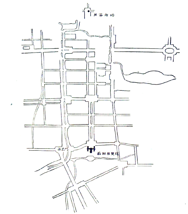 北京展览馆的选址恰好在1953年,“在考虑建筑物更好地与这一区域都市规划配合的问题上,结合了当地具体情况曾更换过好几个方案,经过了反复研究,最后才决定了现在的地址,为了适应这里的区域规划,利用这里的天然条件,而后又将原来的设计重新作了考虑”。从现存的北京展览馆“区域规划总平面”(图5)来看,1953年到1954年期间所做的规划中,的确曾经存在过一条从西郊公园直到长安街并遥望天宁寺塔的长轴线,而北京展览馆正是轴线北端的建筑底景。
