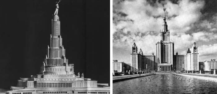 那“社会主义现实主义”到底应该是个什么样子呢?斯大林在1930年代拍板苏维埃宫(图8)之前提到的修改意见可以让我们大略理解这个主义的目标:“苏维埃宫建筑外形的宏伟性、简朴、整体性及精致应该反映出我们社会主义的伟大。” 然而,卫国战争的到来使得苏维埃宫并未建成。二战胜利后的一段时间,“社会主义现实主义”更强调胜利后的英雄主义,最典型的是以莫斯科国立大学(图9)为代表的“八姐妹”高层建筑;另外,就是1954年重新开放的全苏农业展览会,其主馆则是在铺陈开阔的低层建筑上建高塔,也是强调高耸的胜利的感觉。不过在各种关于“社会主义现实主义”的描述中,更多的是目标性、形容式的语言,当时的各种宣言和口号高频度地使用这些词:伟大、光明、宏大、美丽、崇高、愉快、胜利、乐观、繁荣、富饶、精致、简朴、创造性、整体性、统一性等。而在设计中,并没有一套完整的规格和标准——想来这也应该是当年许多社会主义建筑师的苦恼,当然也是后来建筑史家的苦恼。