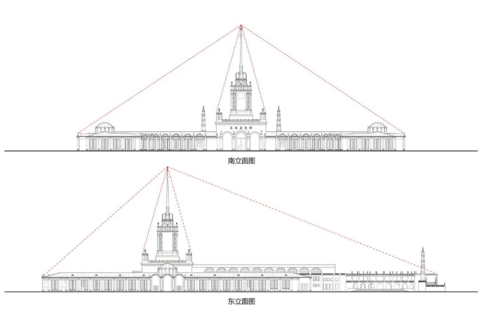 图8 苏维埃宫,伯·米·约凡设计(左)邹德侬先生提出一个直接的说法:“理论不明看建筑”。针对当时前苏联的“社会主义现实主义”,邹先生提出这四条:一,古典主义柱廊;二,低层建筑高尖顶;三,高层建筑哥特化;四,纪念性和象征性。前两条在北京展览馆这里显而易见(图10),第三条这里不用谈了,而纪念性和象征性在北京展览馆的布局和立面都可以看出来:铺陈舒展的平面、对称、轴线、广场、稳定向上的构图、明快活跃的色彩和细节。这里大致可以体会到诸如“宏大”“崇高”“愉快”等词语的物象。图10 北京展览馆立面分析