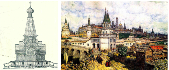 到15世纪末,拜占庭陷落,莫斯科公国成为东正教的中心,随着政治的集权,教会的独立以及领土的扩张,民族的自信在这时期发展起来。莫斯科更偏北的位置也使俄罗斯北方的传统木构建筑(图20)对教堂、钟楼等的影响更加明显,最典型的就是多面体的高耸的帐篷顶,瓦西里三世时期的伏兹尼谢尼亚教堂(1532年)便是一个明证。在世俗建筑中尖顶也越来越多地出现,比例也愈发高耸,大家印象最多的应该是莫斯科克里姆林里的若干塔楼(图21)。北京展览馆像这一时期几乎所有前苏联重要建筑一样,把尖塔而不是穹顶放在中心,似乎也在强调俄罗斯民族传统的核心和重要性。