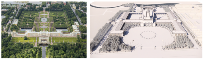 又经过一段时间的混乱和萧条后,俄罗斯帝国取代了莫斯科公国,以“开明的专制”而著称的彼得大帝一面与西方征战,一面又积极地学习西方文化。1712年迁都圣彼得堡更使得在城市规划和建筑上有更大的发挥空间。彼得大帝在积极延聘外国建筑师的同时也遣派大量本土匠人和建筑师出国学习,在圣彼得堡的夏宫(图22),可以看到舒朗的宫殿、庭院、花园式布局,迥异于莫斯科高耸密集的布局方式。再到来自普鲁士的凯瑟琳大帝,更是及时引入西方流行的建筑风格;之后的200年,巴洛克、洛可可、古典主义风格在俄罗斯也是次第兴衰。凡此种种,都是极力维持强大帝国的象征,从俄罗斯自诩的“第三罗马”这个称号上也看得出东斯拉夫向真正的欧洲靠拢和融入,甚至是试图成为正统的努力。北京苏联展览馆的布局恰好由于其功能的需求,建筑、庭院、连廊交替布置,使得布局铺陈开阔,或可联想到夏宫之布局(图23)。我们也可以想见,在1950年代北京城西低矮平旷的郊野中,其宏伟壮阔的样子必然会令人赞叹不已。