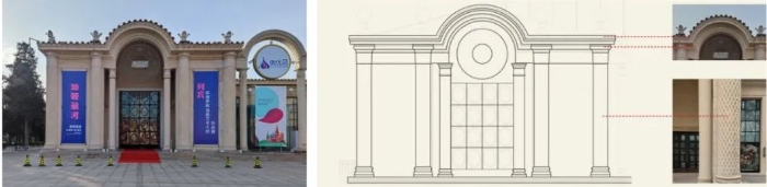 派来的苏联同行……的确有一些高水平的专家,我们不仅从他们那里学到不少进行大规模工业建设、大型建筑工程和城市规划的经验和技术,而且学到了有关的工作方法、工作步骤和工作作风……但是当时学习苏联,也存在一些缺点……苏联当时流行着的建筑上和城市规划上学院式僵死的形式主义也同样在我国泛滥起来,而且至今还可以看到它影响的残余。民族形式在北京苏联展览馆这里正像当年的项目名称一样,成为一个双重问题。前苏联的民族形式已经讨论过,但北京或者是中国的形式以及文化,用当下的话来说,就是地方性这个问题也无法回避。当时的北京苏联展览馆临时设计室设在太庙,中方建筑师戴念慈和毛梓尧能很方便地向前苏联建筑师介绍中国的建筑材料和建筑形式,对中苏双方建筑师来说,与本地文化结合这个问题看起来相对容易一些。前苏联建筑师也意识到这个问题,安德烈耶夫同志认为左右对称、前后呼应、轴线严整的手法,既是俄罗斯的,也同中国的古建筑布局相似。他还提到,“即或是完全采自苏联的形式,它经过了中国的建筑师、中国工人之手所创造出来的东西,已经具有一定的中国风味。”尽管这样的表达有一定的道理,我们还是能感觉到这更多的是在通过叙事方式的提炼来寻找可行的说法。事实上,在这样一个快速设计和建造的项目上,用具体的能看到的形象和做法来表达中国意象成为一个更有效的办法。图24 中央入口刻花柱子