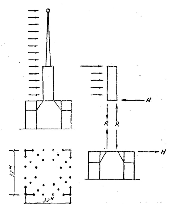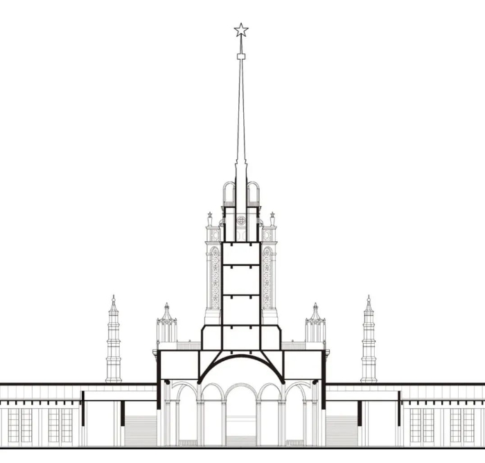 在设计上和施工上,此时的合作也的确使中国的建设者有机会快速学到很多经验。比如细部装饰必须做足尺模型,对建筑材料需要充分考查其制造工艺等。在结构设计上,前苏联结构工程师郭赫曼提出最大限度地节省材料、施工方便等原则。其具体的设计思想强调结构设计的整体性思维,比如结合土壤情况、建筑高度等条件,放弃当时大型建筑流行的桩基础,采用箱型基础;又比如中央尖塔的水平荷载通过斜撑传递到下层结构框架,利用结构的整体性抵抗水平荷载,而不是简单地加大支撑截面(图30)。结构设计根据具体情况采用不同的方法。工业馆和电影厅的空间需求不同,屋顶结构的拱曲率也不同;工业馆屋面曲率大,采用了无铰拱架,水平力直接传到土壤上;而电影厅屋面曲率小,用双铰拱,把推力传到由边梁和拉杆形成的矩形框架上(图31)。
