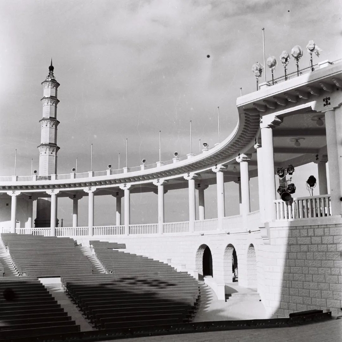 二是前辈们在各种约束下的依旧努力、求真求新的态度。很多放到现在也是很先进的设计思想,在前辈那里如本能一般流畅地表达出来。比如建筑和环境的关系,在北侧后湖和露天剧场体现得尤为明显(图35、图36)。一方面,剧场优雅的立面为后湖提供了视觉焦点,另一方面,剧场二层通透的环廊又成为观看后湖的平台,二者的对话与融合,自然而妥帖(只可惜1959年剧场被改为室内,立面变得封闭厚重,想来其实其二层疏散环廊本还有可能保持室外的感觉)。又比如节能、节材,像中央的工业馆,利用筒拱的穿插,形成大面积的自然采光和通风,空间、结构和节能在这里浑然天成(图37、图38)。郭赫曼还提出尽量就地取材,避免材料运输上浪费劳力等,也是现在绿色建筑的评判标准之一。图35 剧场立面与后湖景观相映