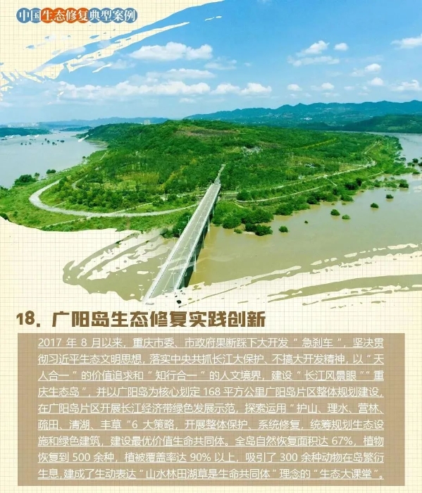 广阳岛生态修复秉承生态优先、绿色发展理念,紧紧围绕“长江风景眼、重庆生态岛”定位,积极探索基于自然的解决方案,创新运用“护山、理水、营林、疏田、清湖、丰草”6大策略,实践多用自然、生态、柔性,少用人工、工程、硬性的施工方法,系统推进自然恢复、生态修复,丰富生物多样性,融合高品质生态设施和绿色建筑,建成上坝森林、高峰梯田、山顶人家、油菜花田、粉黛草田、胜利草场等24个生态修复示范地,记录到的植物由生态修复前的383种增加到627种,动物由310种增加到460种。历经生态蝶变的广阳岛,宛如一幅原生态的巴渝乡村田园风景画卷,成为了生动表达山水林田湖草生命共同体理念的“生态大课堂”。