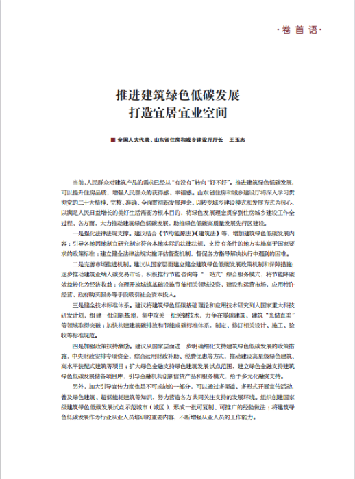 当前,人民群众对建筑产品的需求已经从“有没有”转向“好不好”。推进建筑绿色低碳发展,可以提升住房品质,增强人民群众的获得感、幸福感。山东省住房和城乡建设厅将深入学习贯彻党的二十大精神,完整、准确、全面贯彻新发展理念,以转变城乡建设模式和发展方式为核心、以满足人民日益增长的美好生活需要为根本目的,将绿色发展理念贯穿到住房城乡建设工作全过程、各方面,大力推动建筑绿色低碳发展,助推绿色低碳高质量发展先行区建设。