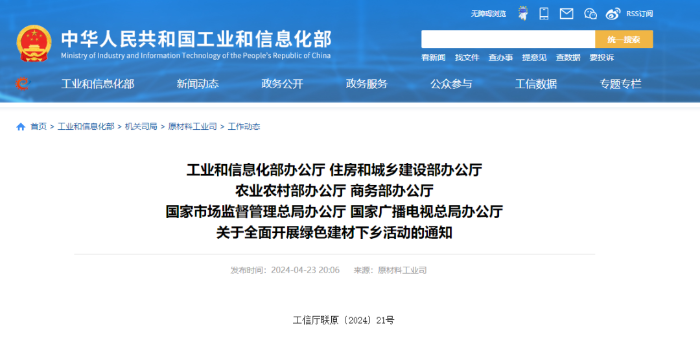 工业和信息化部、住房城乡建设部、农业农村部、商务部、国家市场监管总局、国家广播电视总局等六部门近日联合印发通知,部署在全国范围内深入开展绿色建材下乡活动。活动主题为“绿色建材进万家 美好生活共创建”,时间为2024年—2026年。