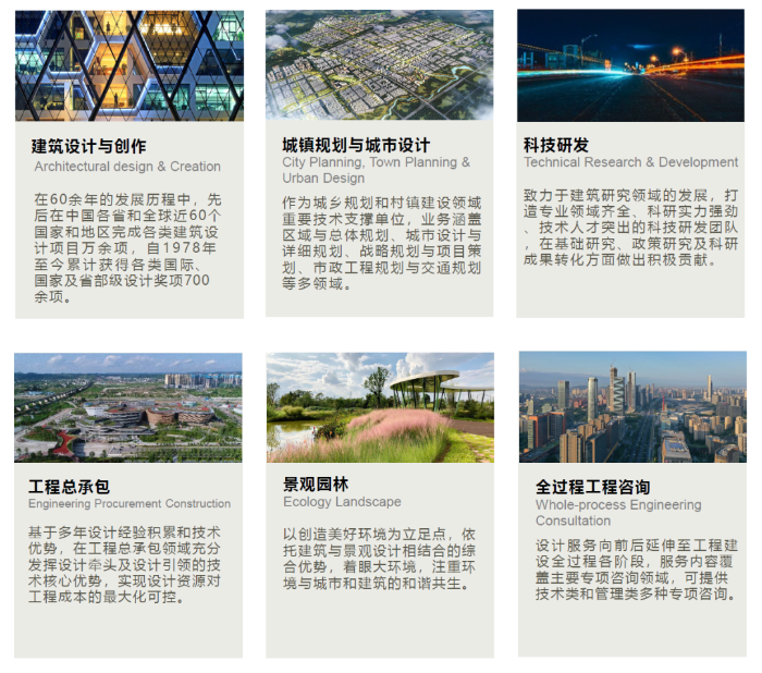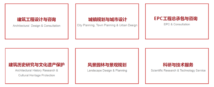 目前,中国院已基本形成集设计、科研、建设于一体的集团化产业构架,包括建筑工程设计与咨询、城镇规划与城市设计、EPC工程总承包与咨询、建筑历史研究与文化遗产保护、风景园林与景观规划、科研与技术转化等6大业务板块。