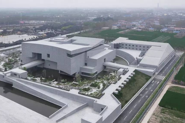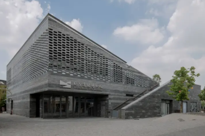 无锡梅里遗址博物馆位于江苏省无锡市新吴区。建筑内外空间的布局围绕整体参观流线展开,采取上下两层空间回转串接的方式,将各个展厅首尾相连,利用单侧的坡屋顶在中部设置了两层贯通的展区,在馆外二层出口处坡顶下设置开敞式共享空间,使建筑整体形态虚实相生、生动通透。屋面采用仿青瓦深灰色直立锁边金属屋面板,外观材料主要是一种灰色的凝灰岩(洞石),其青灰色彩和细腻质感完美吻合建筑的“历史感”,同时易融于周边的街巷之中。展厅内地面与墙面主要采用深灰和浅灰色,衬托作为绝对主角的出土器物与解说图文;文字与墙面的黑白对比,又很好地呼应了江南印象。