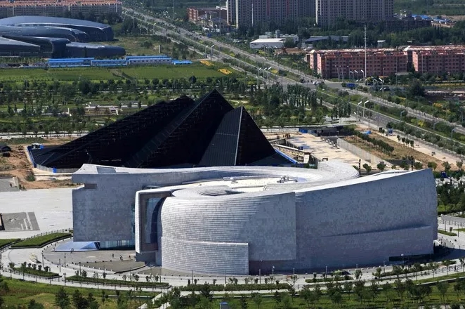 大同博物馆位于山西省大同市老城区东侧御东新区的核心位置,其建筑设计承袭大同深厚的历史文化底蕴,从悠久的龙图腾文化中汲取灵感,并与当地典型的火山群地貌暗合。两个拙朴的弧形体量围绕中庭和庭院盘旋而起,向外生长出数个分叉,为观展休息区引入光线和风景;作为主体的展示空间则随着弧形体量展开,使参观者仿佛遁入幽深的石窟之中。遒劲有力的建筑形体在端部直接暴露出功能性断面,呈现其符号化形态的同时又与汉字笔画产生微妙的联系,使建筑同时具备了力量感和文化内涵。