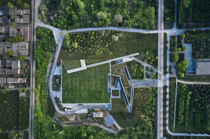 西安秦始皇帝陵铜车马博物馆位于陕西省西安市临潼区秦陵路秦始皇帝陵博物院骊山园内。选用清水混凝土作为主导内外空间的界面材料,不做装饰,使结构的力量得以真实呈现。混凝土的沉稳细腻、含蓄内敛,为突显文物主题提供了纯粹而神秘的背景质地。半埋入地下的建筑体量只有两个立面暴露在外,面对着沟底的“坎壁”。大面积屋顶覆土植草,与周边的陵区环境完全融为一体。